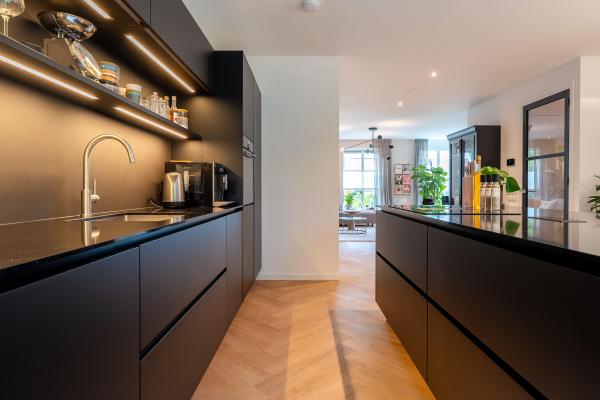 Entree/ruime hal, wandcloset met fonteintje, fraaie lichte living met zit-en eetgedeelte, luxe open keuken voorzien van kookeiland en diverse inbouwapparatuur, werkkamer, berging.