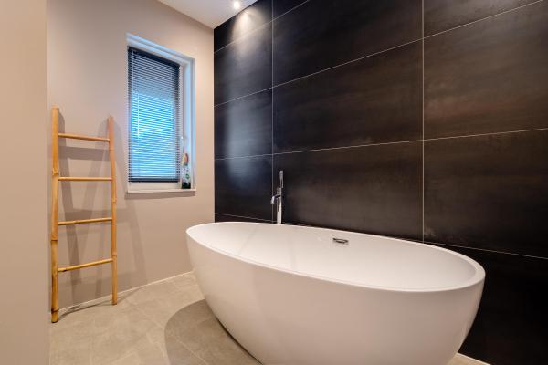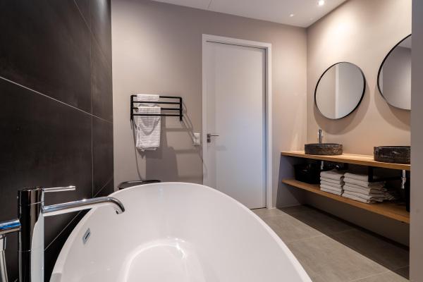 Overloop, 2 riante slaapkamers (eenvoudig 3 van te maken), moderne badkamer met inloopdouche, vrijstaand bad, wastafelmeubel met 2 kranen, separaat toilet.