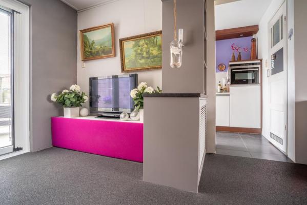 Entree/hal met trapopgang naar de eerste verdieping, modern toilet, lichte woonkamer met erker, fraaie grindvloer, openslaande deuren naar de zonnige achtertuin, luxe halfopen keuken voorzien van diverse inbouwapparatuur.