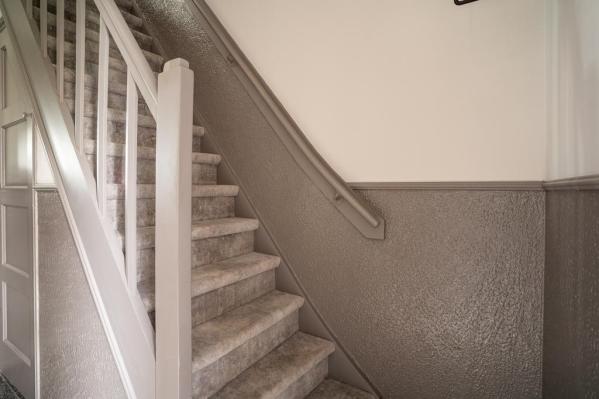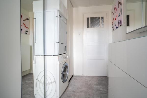 Overloop, slaapkamer 1 met balkon op het zuiden, slaapkamer 2 aan de voorzijde, badkamer met douche en wastafel, slaapkamer 3, nu in gebruik als wasruimte met kasten.