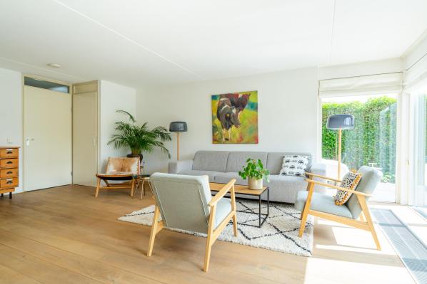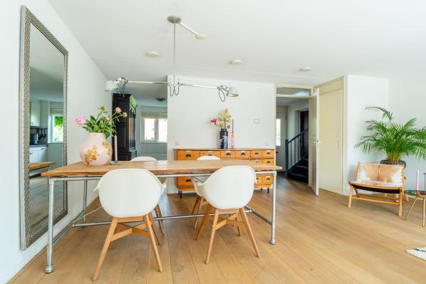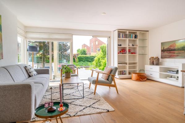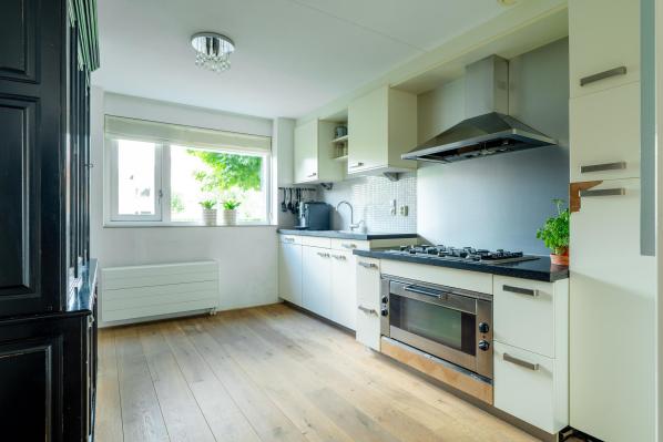 Entree/hal met trapopgang, wandcloset met fonteintje, ruime, lichte uitgebouwde woonkamer met uitzicht over het water en openslaande deur naar de tuin, open keuken in rechte opstelling met diverse inbouwapparatuur.