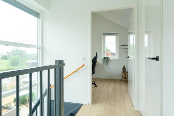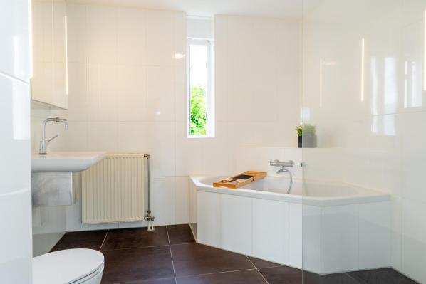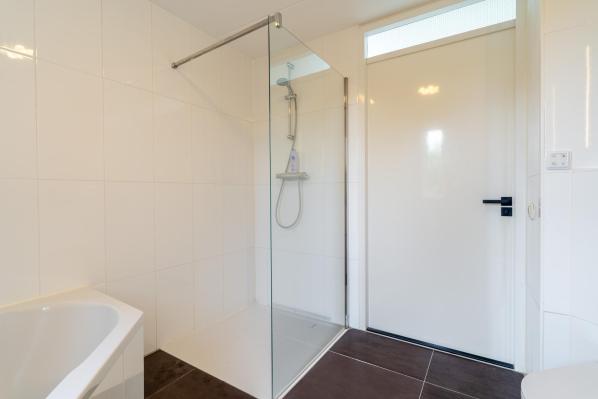 Overloop, 2 slaapkamers, moderne badkamer met inloopdouche, hoekbad, wastafel en wandcloset.