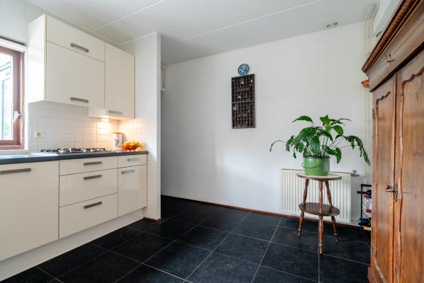 Entree/hal met meterkast, trapopgang en toilet. Vanuit de hal toegang tot de ruime en lichte woonkamer, die in open verbinding staat met de eetkamer. De keuken is centraal gelegen en voorzien van diverse inbouwapparatuur, met aansluitend een praktische bijkeuken. Vanuit de bijkeuken is er toegang tot de aangebouwde garage, ideaal voor opslag, hobby of het stallen van een auto.