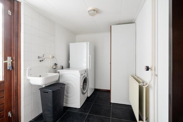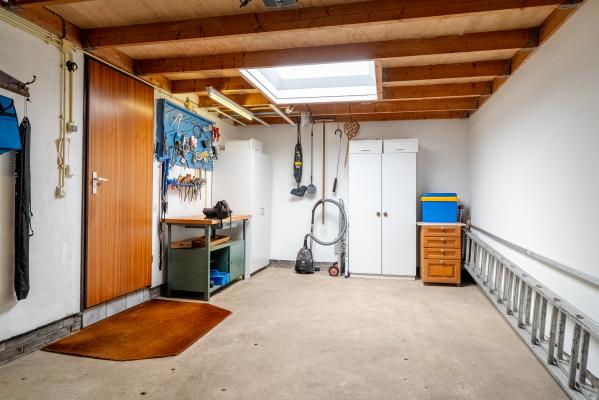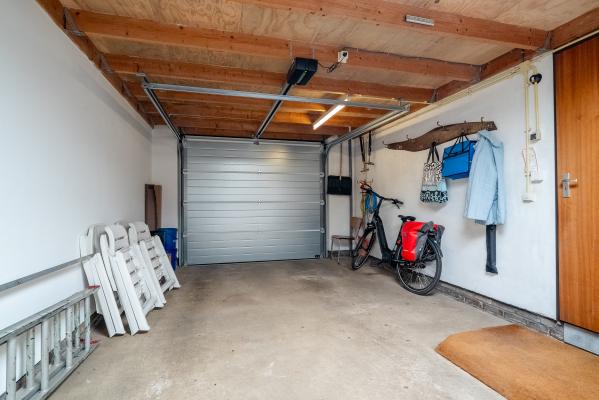Aangebouwde garage, bereikbaar via de bijkeuken en voorzien van voldoende ruimte voor opslag en/of het stallen van een auto.