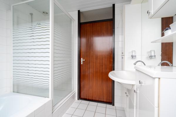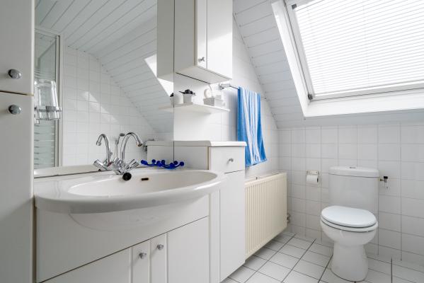 Overloop met toegang tot drie slaapkamers. De slaapkamers zijn van goed formaat en bieden volop mogelijkheden voor slapen, werken of hobby’s. De badkamer is voorzien van een douche, wastafel en toilet.