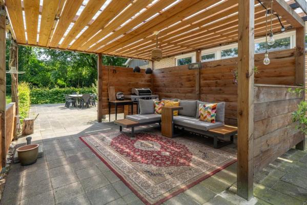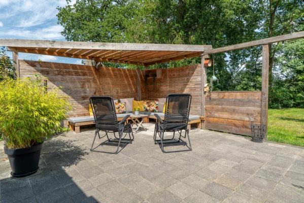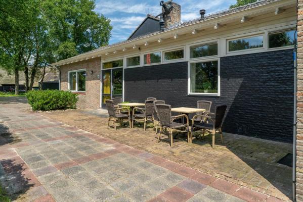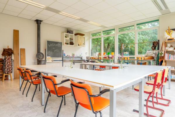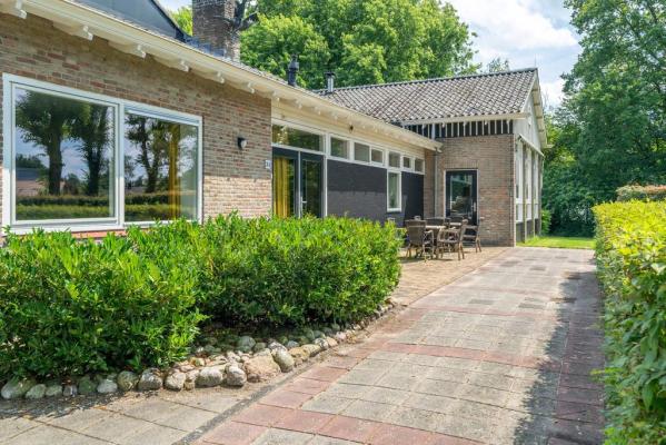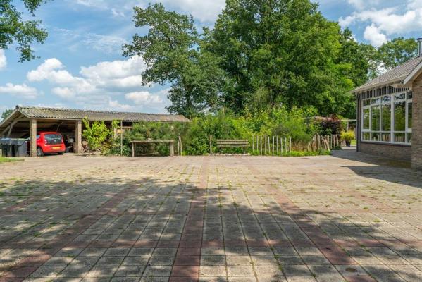 Aan de rand van het rustige Drentse dorpje Eén gelegen royaal vrijstaand woonhuis dat vroeger diende als schoolgebouw met een fraai aangelegde tuin met grote overkapping en dubbele carport.