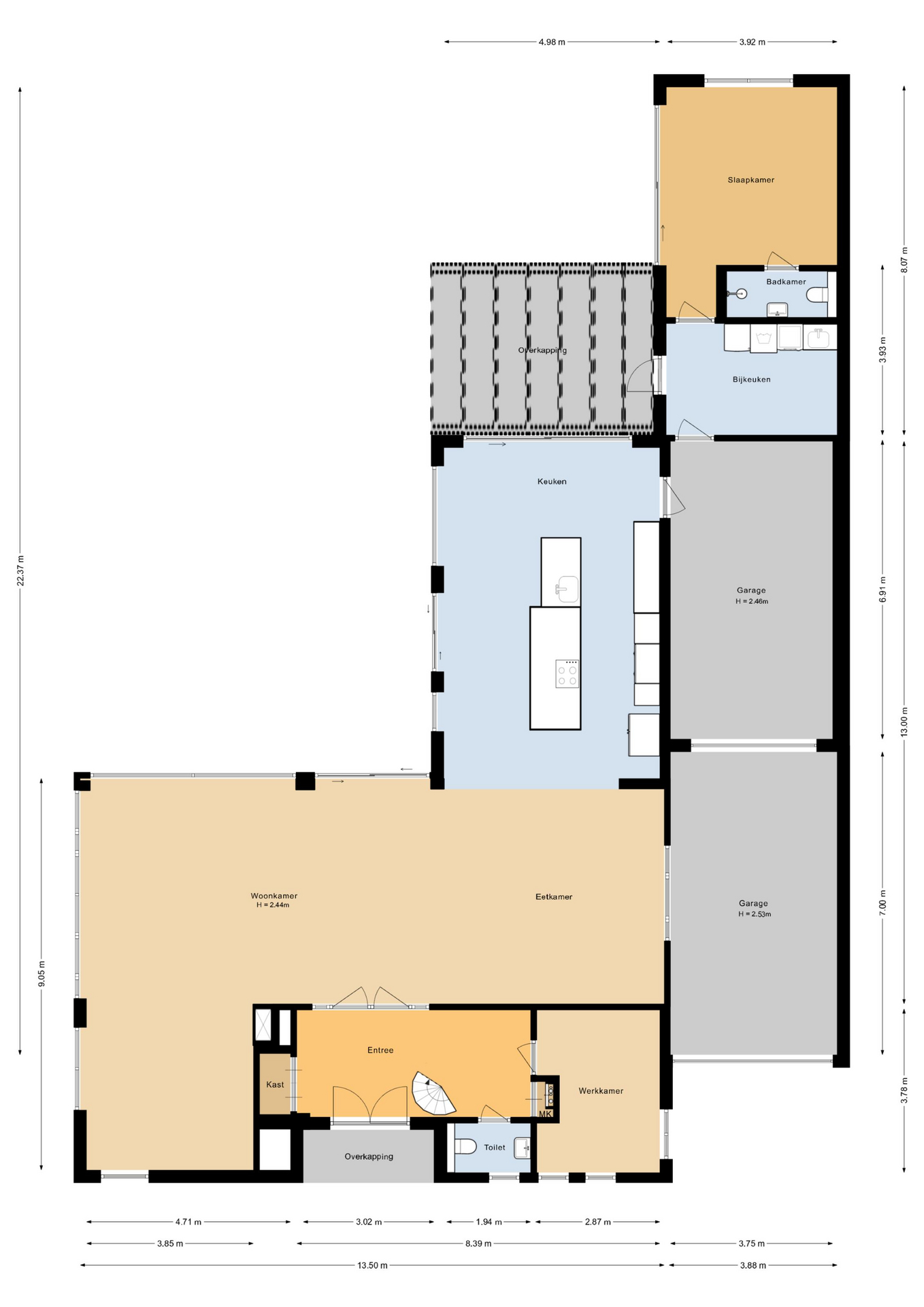 Entree/royale hal met trapopgang, toilet met fonteintje, werkkamer, lichte U-vormige living met gashaard, luxe open keuken met riant kookeiland en diverse inbouwapparatuur, bijkeuken, slaapkamer met ensuite badkamer.