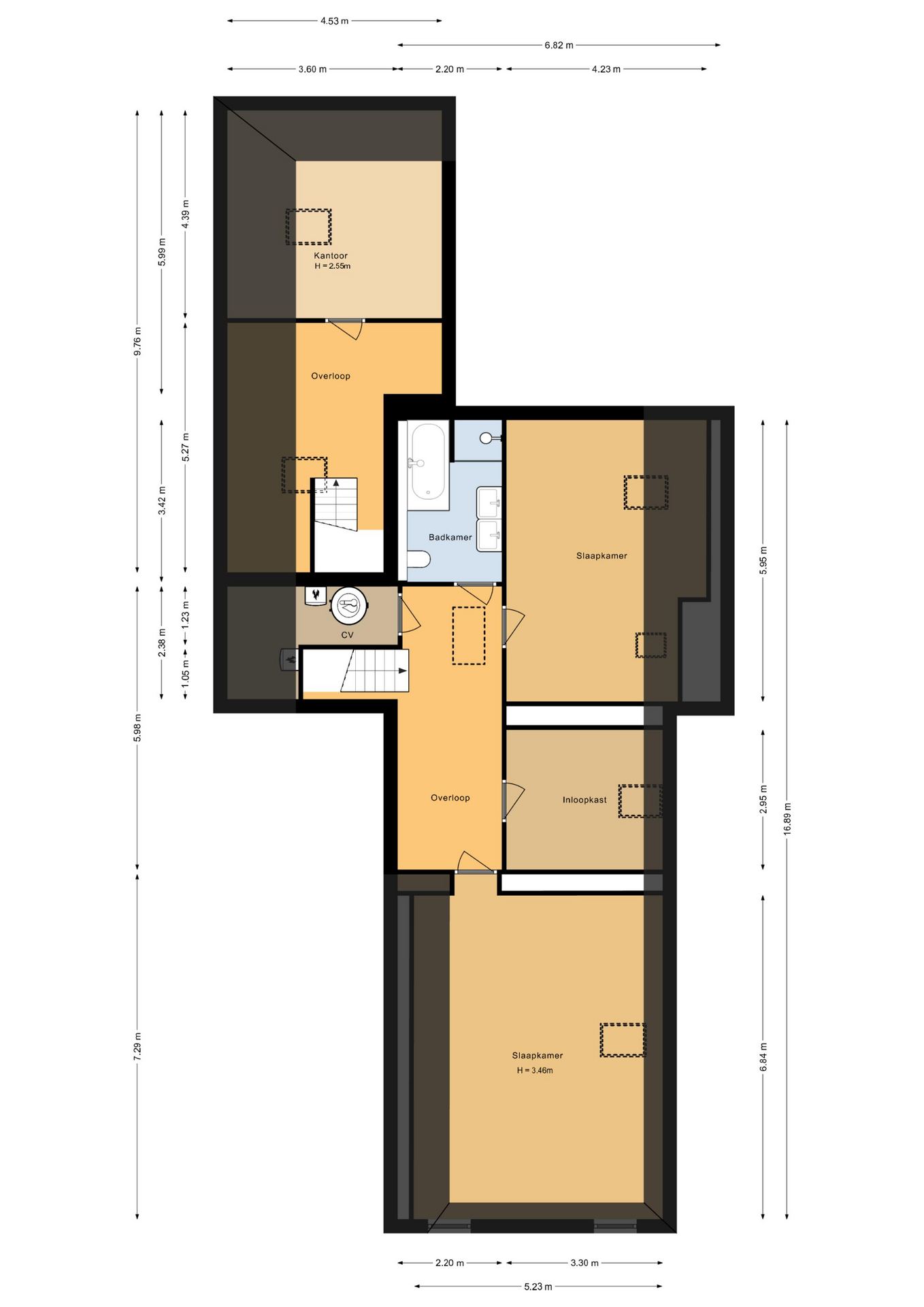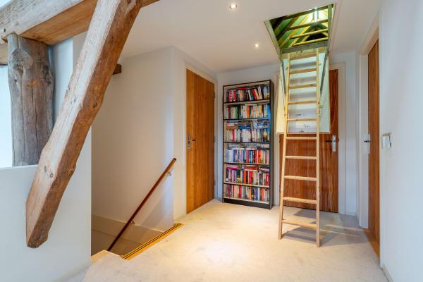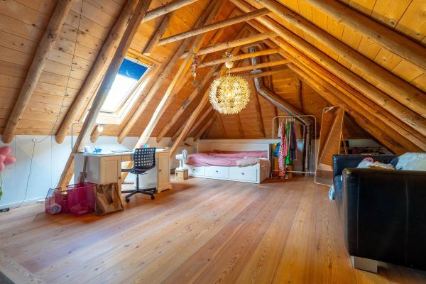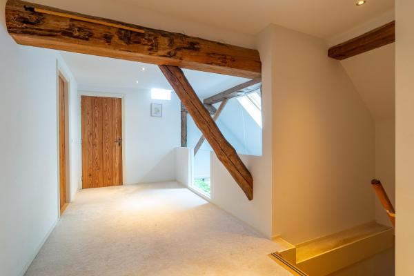 Overloop, 2 ruime slaapkamers, inloopkast, badkamer met douche, ligbad, dubbele wastafel en toilet, stookruimte. Via een 2e overloop bereikt u 3e slaapkamer welke nu in gebruik is als werkkamer.