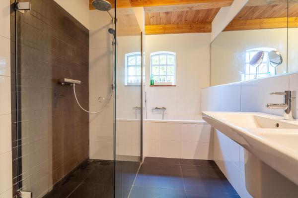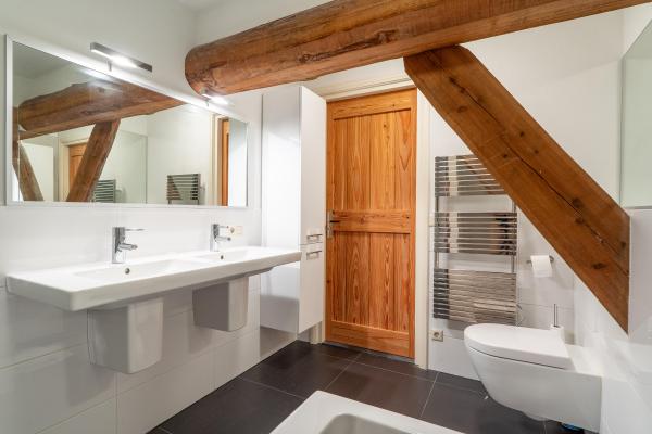 - Ligbad, Toilet, Douche, Dubbele Wastafel, Wastafel