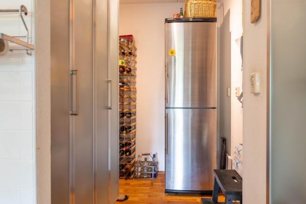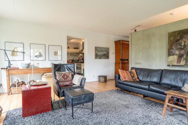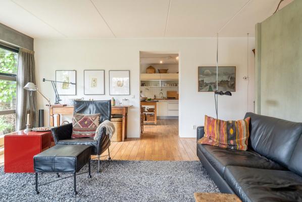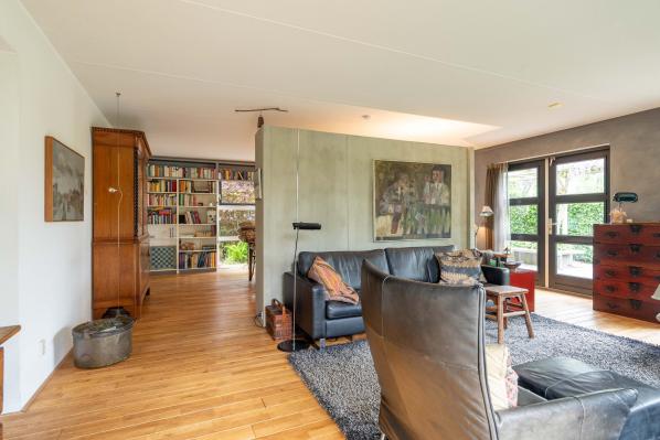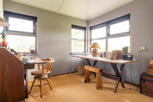 Entree/gang, hal met trapopgang, toilet met wandcloset en fonteintje, woonkamer met twee openslaande terrasdeuren, open haard en half open keuken voorzien van diverse inbouwapparatuur, bijkeuken/ provisieruimte, ruime slaapkamer van ca. 17 m², badkamer met vloerverwarming, douche, ligbad en extra dubbele wastafel. Vanuit de hal heeft u ook toegang tot de inpandige geïsoleerde dubbele garage van ca. 36 m² (als hobby-/muziekkamer ingericht).