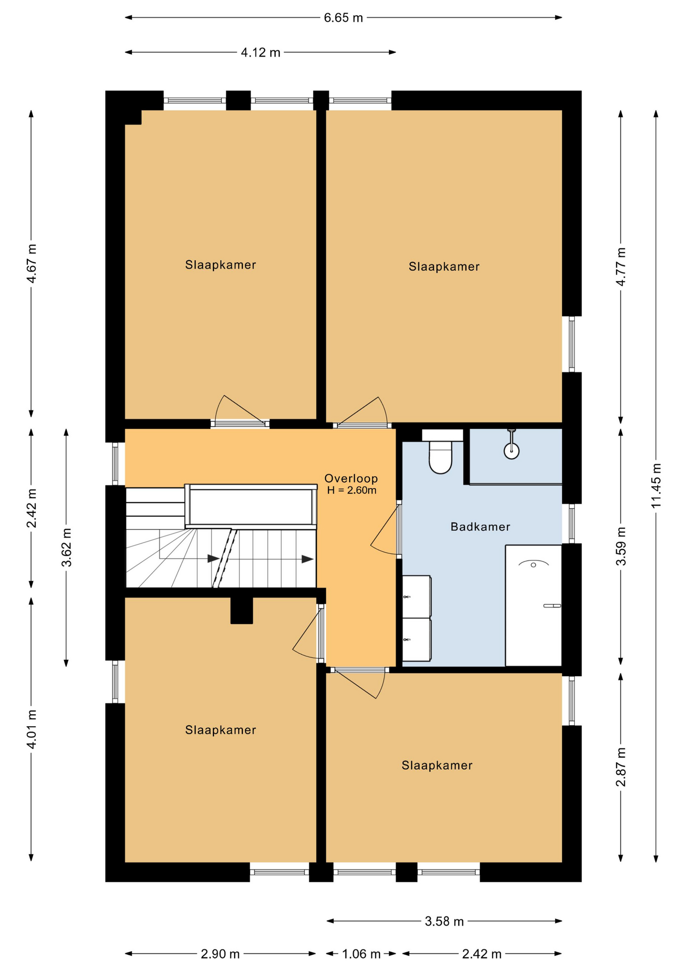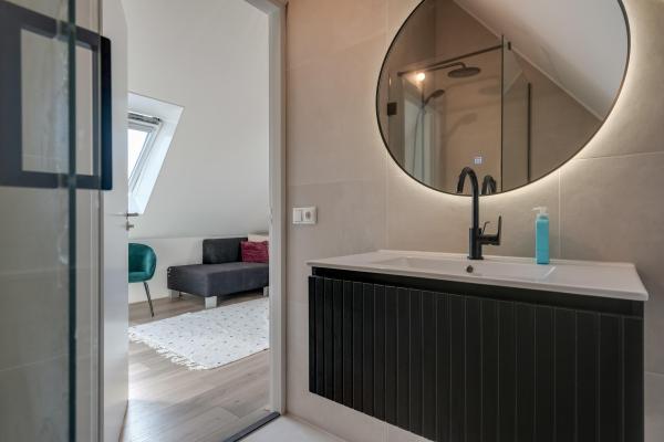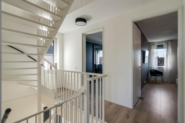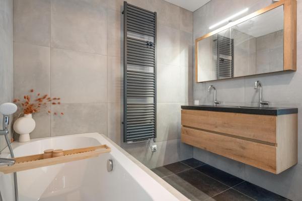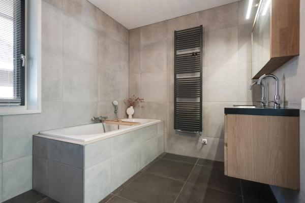 Overloop, 4 slaapkamers, moderne badkamer met douche, ligbad, dubbele wastafel en wandcloset.