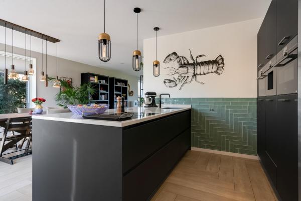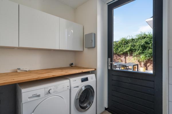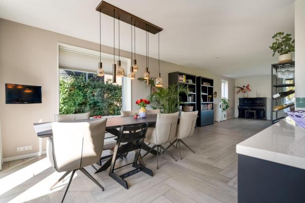 Entree/hal met trapopgang, wandcloset met fonteintje, L-vormige Living met openslaande deuren naar de tuin, luxe open keuken met kookeiland en diverse inbouwapparatuur, bijkeuken met toegang naar buiten en naar de geïsoleerde garage voorzien van vloerverwarming.