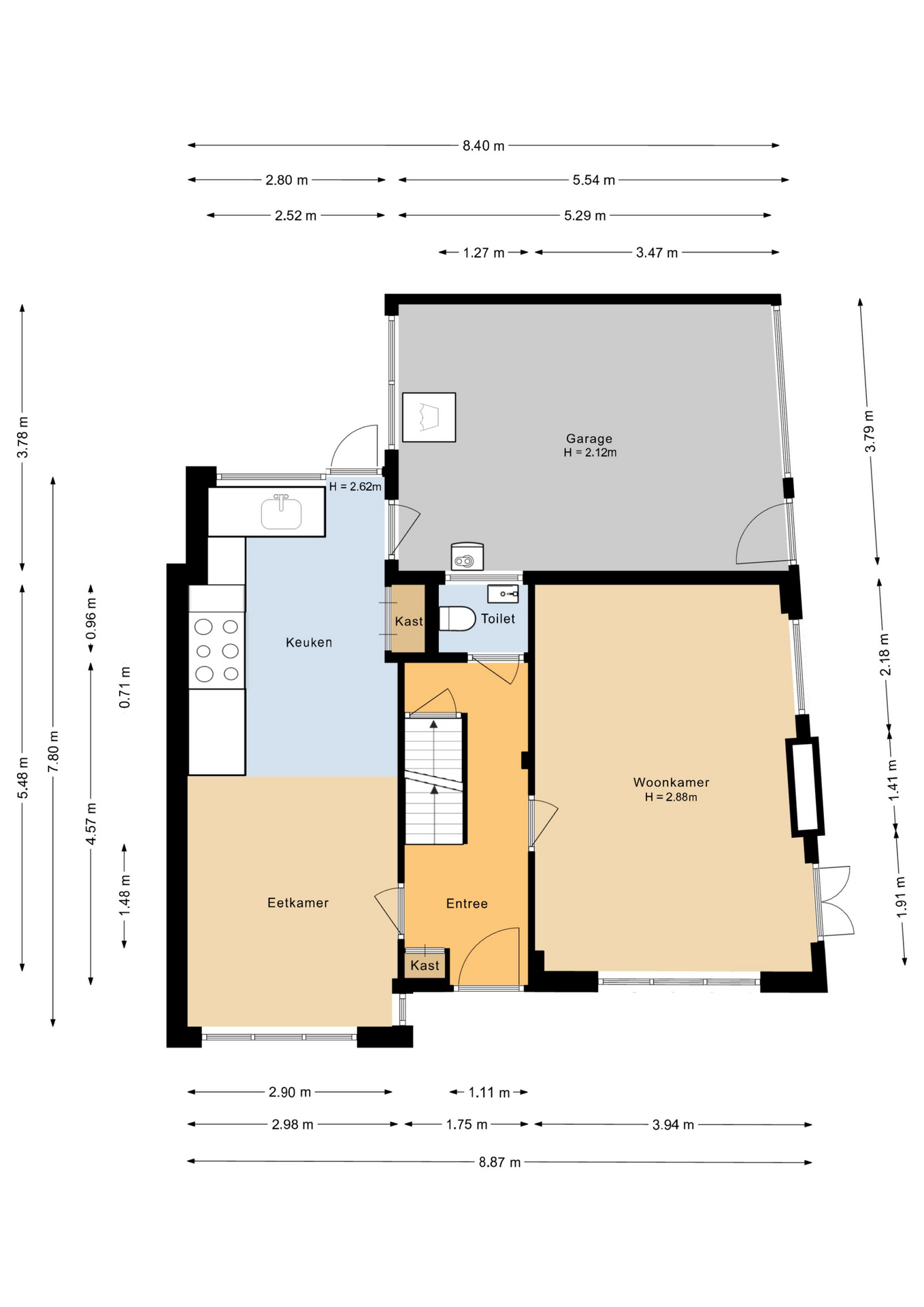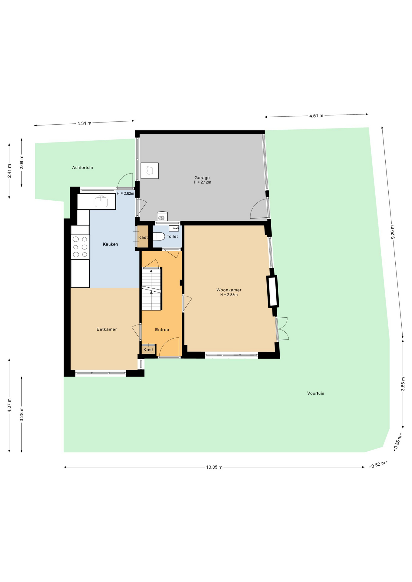 Entree/hal met trapopgang, toilet met fonteintje, lichte woonkamer met openslaande deuren naar de tuin, ruime woonkeuken voorzien van inbouwapparatuur, o.a. een SMEG-6 pitsgasfornuis/oven, vaatwasser en cooker. Vanuit de keuken heeft u toegang tot de garage/bijkeuken en de tuin. Vanuit de hal loopt een trap naar beneden naar de ruime voorraadkelder en berging (2 meter hoog).