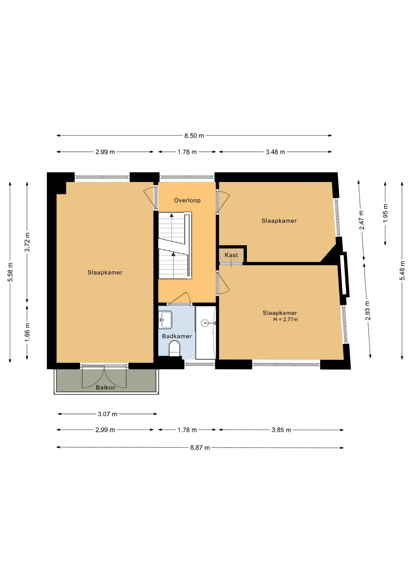 Overloop, 3 slaapkamers, waarvan één met toegang tot het balkon (eenvoudig op te delen), badkamer met ligbad/douche, wastafel en toilet.