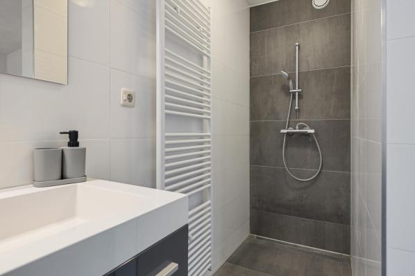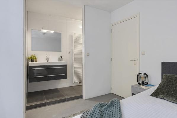 Entree, woonkamer met nette open keuken voorzien van enige inbouwapparatuur, toilet met fonteintje, slaapkamer met moderne badkamer en suite voorzien van inloopdouche en wastafelmeubel.
