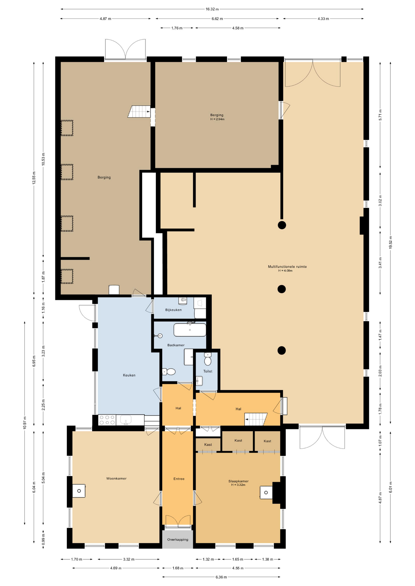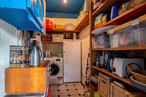 Entree/hal, woonkamer, woonkeuken met bijkeuken, badkamer en separaat toilet. Tevens een slaapkamer met vaste kasten. Aangrenzend bevinden zich meerdere bergingen en een royale multifunctionele ruimte, geschikt voor uiteenlopende doeleinden.
