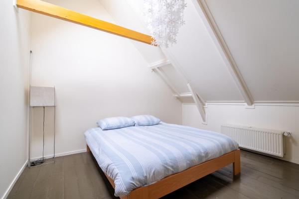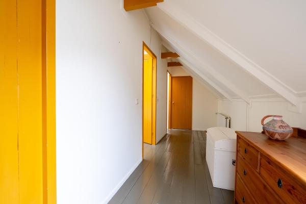 Overloop, drie slaapkamers, een tweede badkamer, bergruimte en een grote zolderruimte met mogelijkheden voor extra kamers of werkruimte.