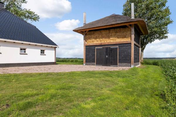 Naast de woning staat een vrijstaande hooischuur/garage met ruimte voor twee auto's en een bovenverdieping die naar eigen wens ingericht kan worden, met een mogelijke 380v-aansluiting. Indien gewenst, mag voor de hooischuur nog een grotere (kap)schuur geplaatst worden. Voor paardenliefhebbers is er zelfs de mogelijkheid om het naastgelegen perceel bij te kopen.