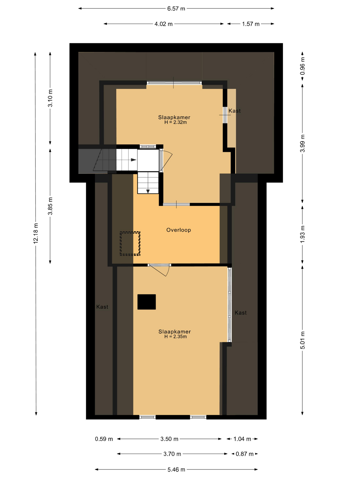 Overloop, 2 slaapkamers, beide met dakkapel.