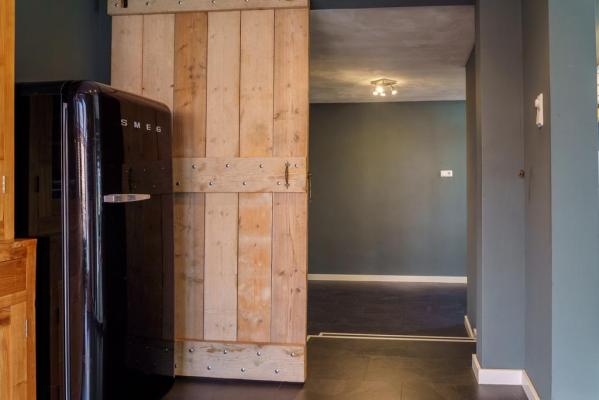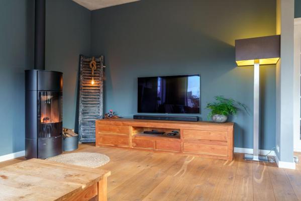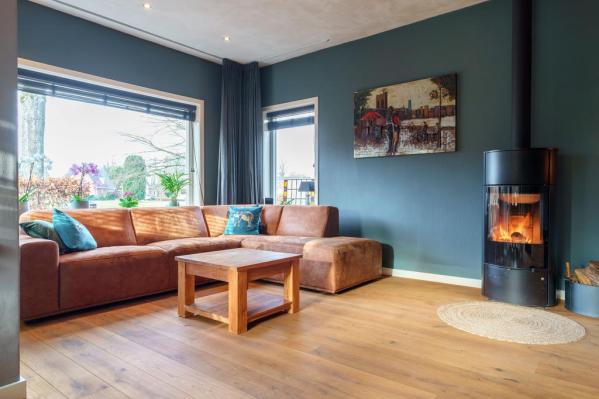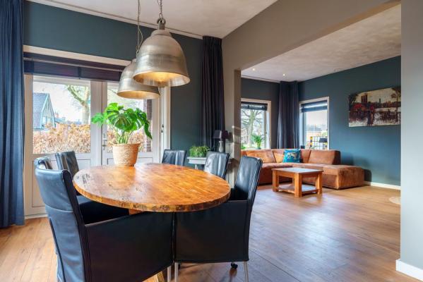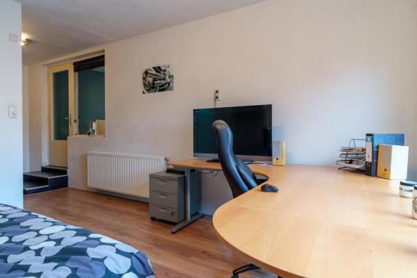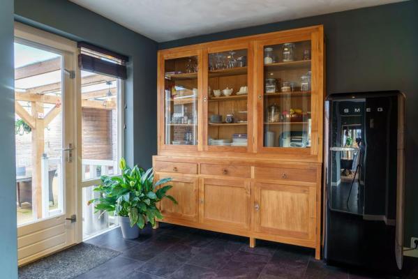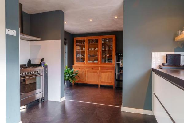 Entree/hal met trapopgang, wandcloset met fonteintje, Z-vormige living met o.a. een living met houtkachel, eethoek met openslaande deuren naar de tuin, moderne luxueuze woonkeuken voorzien van diverse inbouwapparatuur, groot SMEG fornuis en toegang tot de provisiekelder. Vanuit de keuken bereikt men tevens de achterhal met zijentree en slaapkamer met openslaande deur naar de achtertuin en badkamer met douche en wastafel. Een kantoor of praktijk aan huis is in deze ruimte ook niet ondenkbaar!