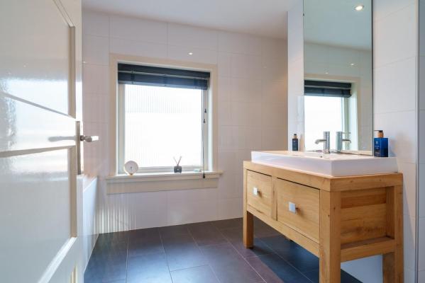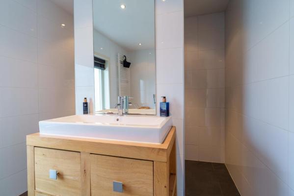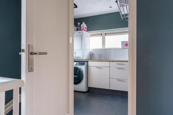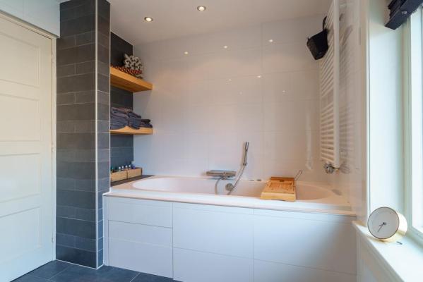 Overloop, 2 riante slaapkamers, moderne badkamer voorzien van ligbad, inloopdouche, wandcloset en wastafelmeubel. Bovendien bevindt zich aan de overloop nog een wasruimte met keukenblok en witgoed-aansluitingen.