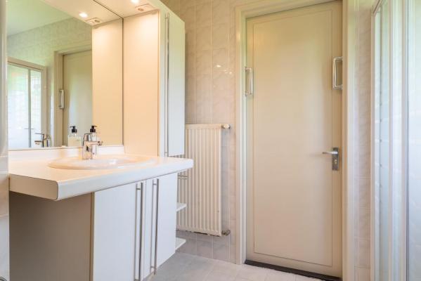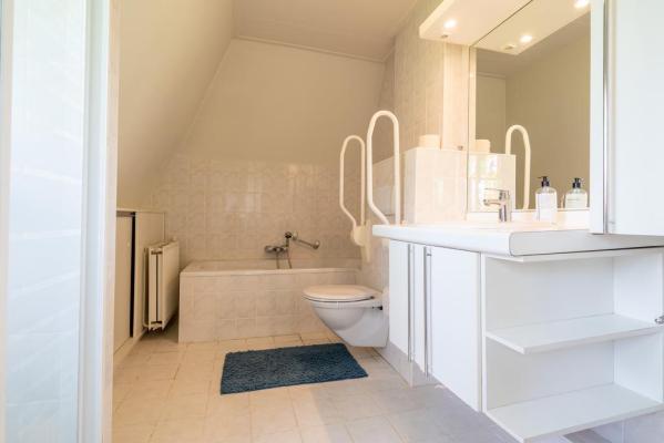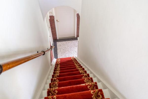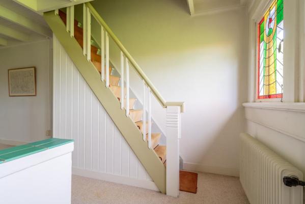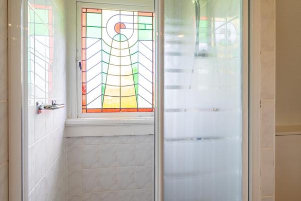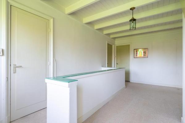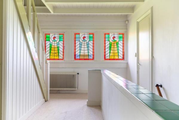 Ruime overloop met prachtige glas-in-lood ramen, 3 slaapkamers voorzien van vaste kasten, waarvan één met toegang tot het balkon aan de achterzijde, badkamer met douche, ligbad, wastafelmeubel en 2e toilet.