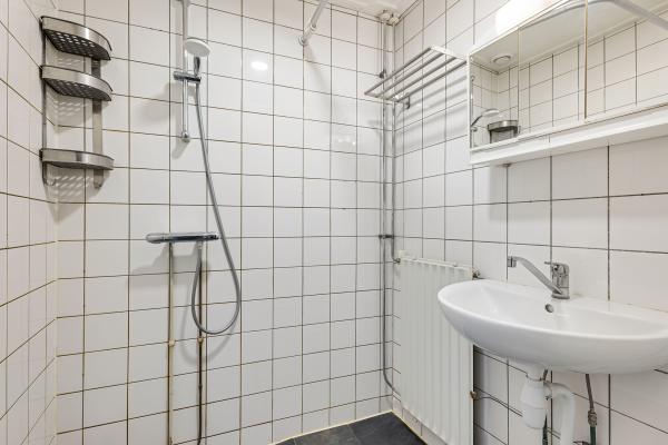 Overloop, 2 slaapkamers, badkamer met douche en wastafel.