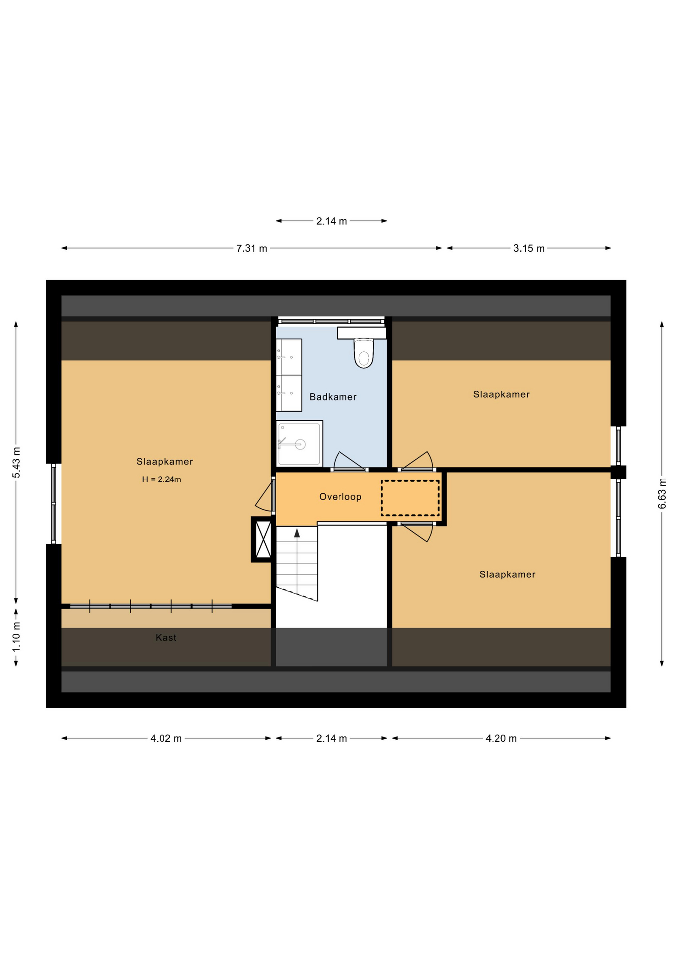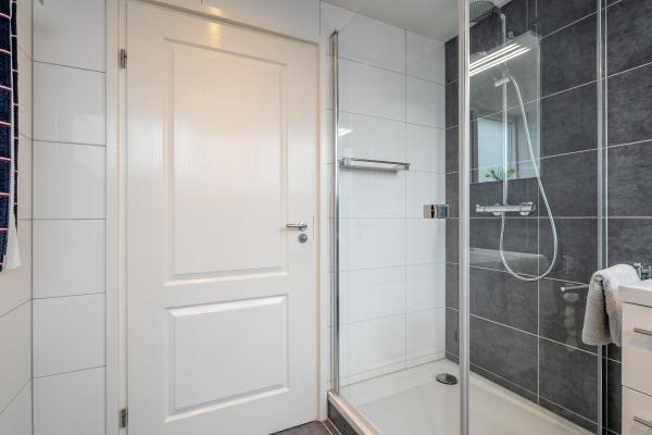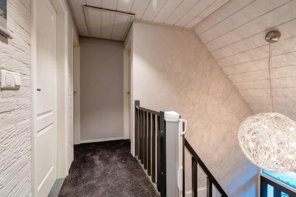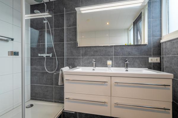 Overloop, drie ruime slaapkamers, luxe 2e badkamer met wastafelmeubel met dubbele wastafel, inloopdouche, sauna en wandcloset.