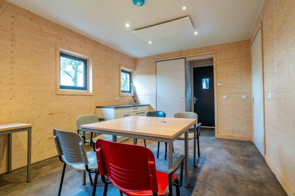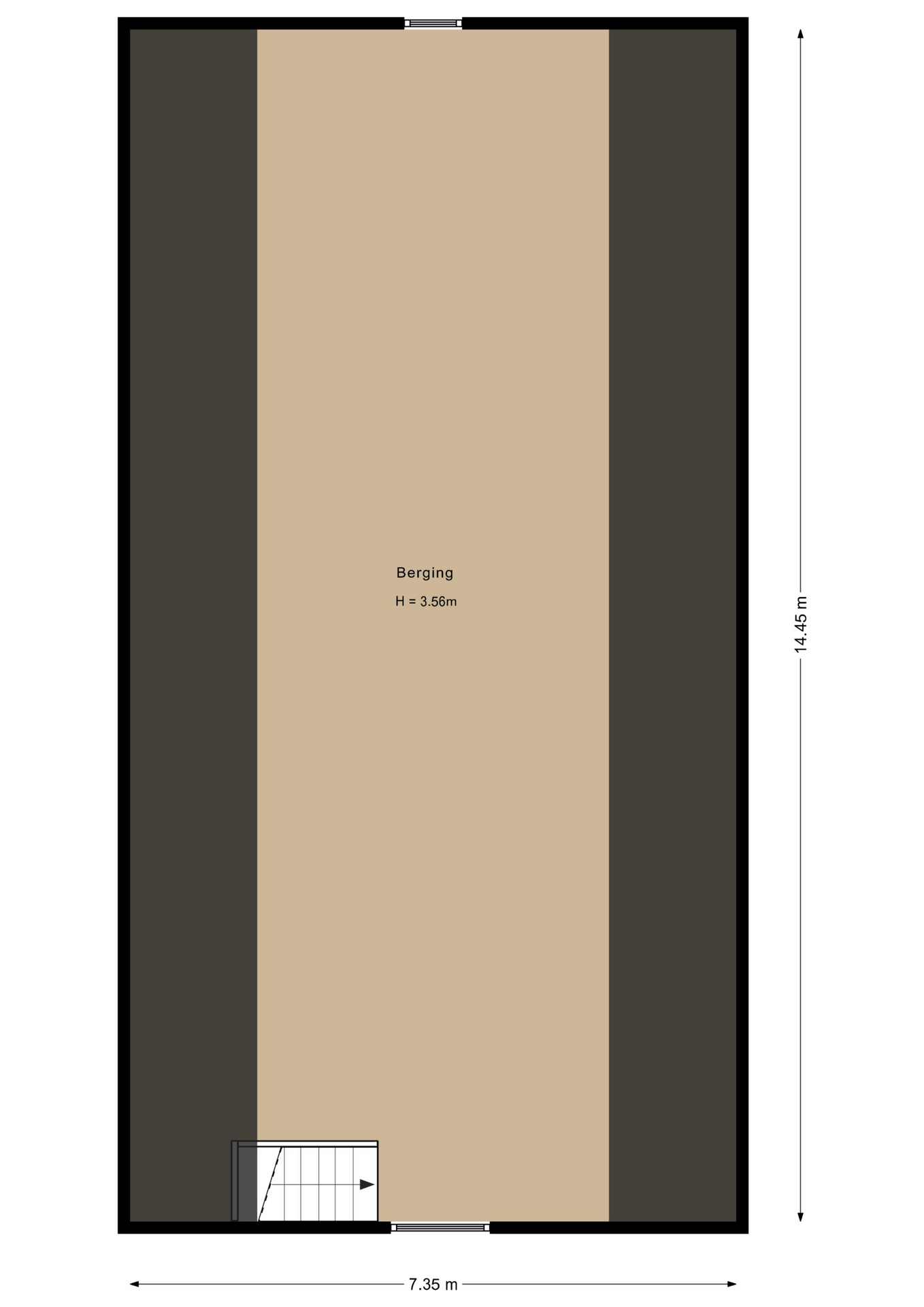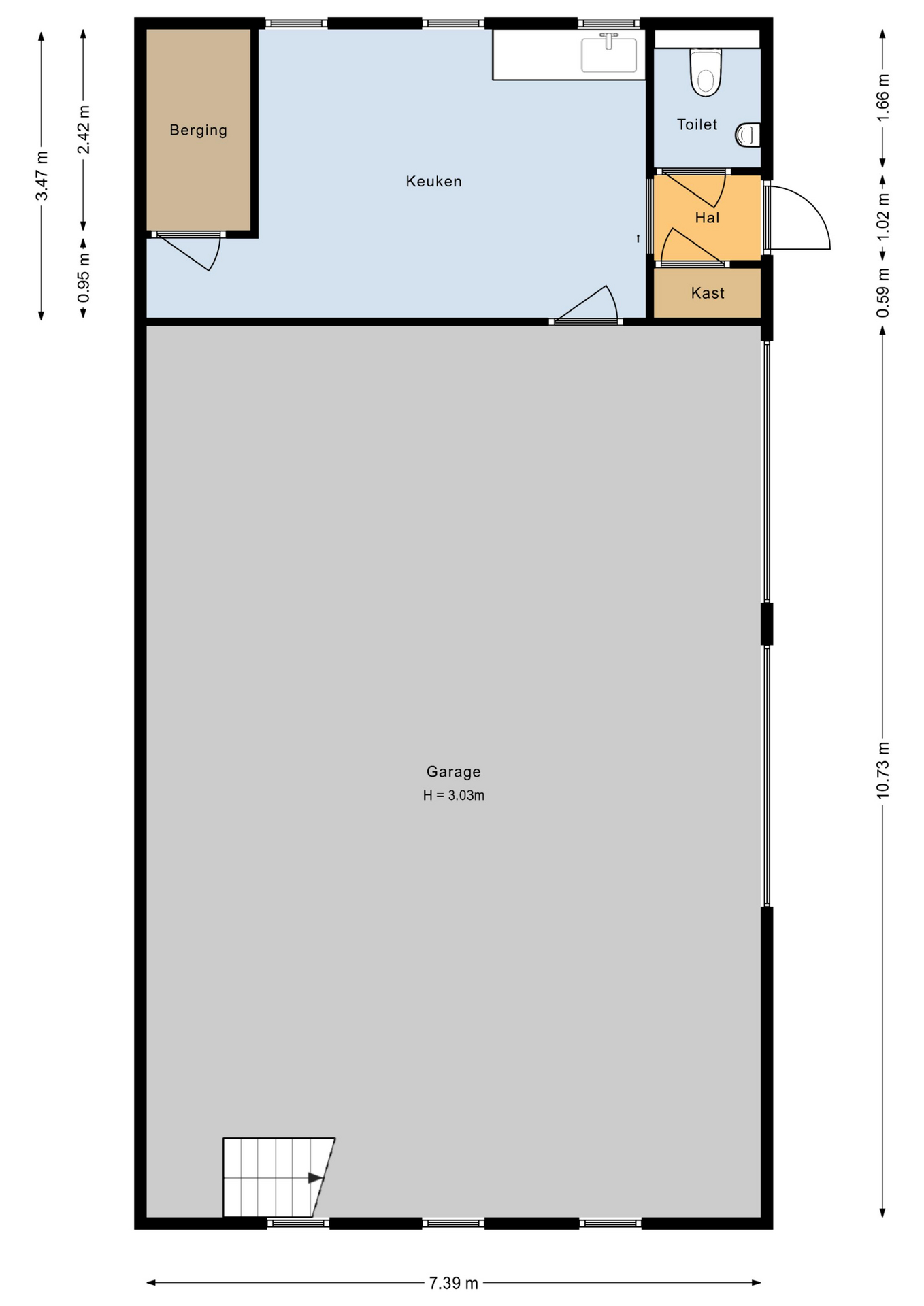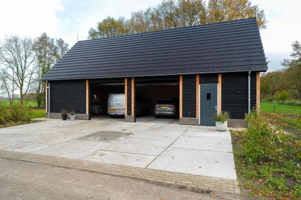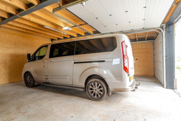 Garage voor twee auto's met een keuken, toilet en op de eerste verdieping een ruime berging.