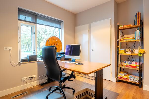 Entree/ruime hal met trapopgang, moderne woonkeuken voorzien van inbouwapparatuur, woonkamer met gezellige openhaard kachel, multifunctionele ruimte nu in gebruik als werkruimte, wasruimte, bijgebouwde royale slaapkamer, luxe badkamer met wastafelmeubel met dubbele wastafel, inloopdouche, urinoir en wandcloset met fonteintje.