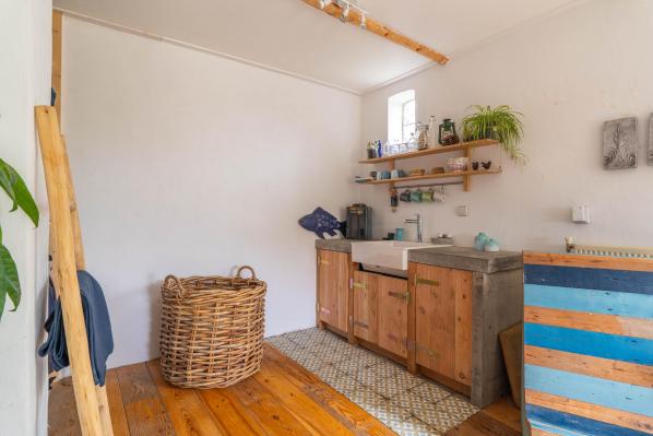 Entree/hal met trapopgang, toilet met fonteintje, woonkamer met balken plafond, open haard en een houtenvloer, gezellige woonkeuken voorzien van inbouwapparatuur en vloerverwarming, bijkeuken, gang, ruime slaap-/studeerkamer met keukenblok en openslaande deuren naar de tuin. Vanuit de tweede hal met 2e voordeur heeft u tevens toegang tot de wasruimte en moderne 2e badkamer met douche en wastafel. Dit maakt het geheel ook zeer geschikt voor dubbele bewoning, mantelzorg of het hebben van een praktijk aan huis.