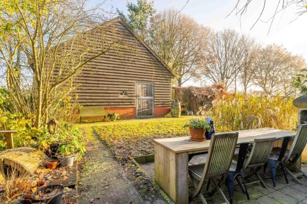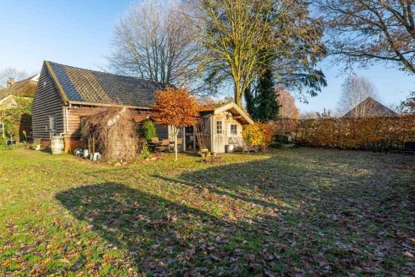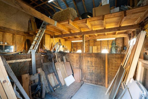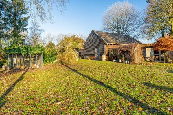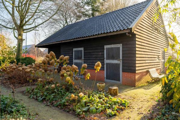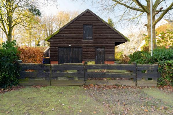 De riante schuur die zich achter de boerderij bevindt omvat o.a. een garage, een stalruimte met meerdere paardenboxen en een hooizolder.