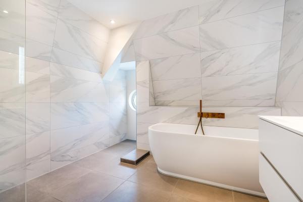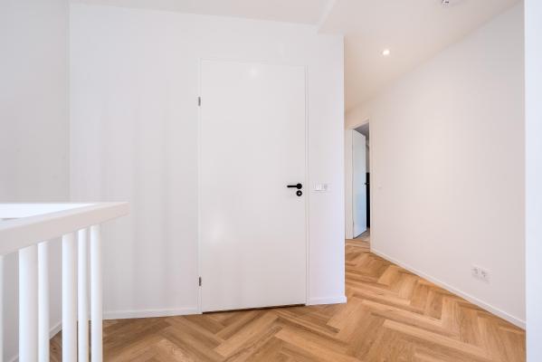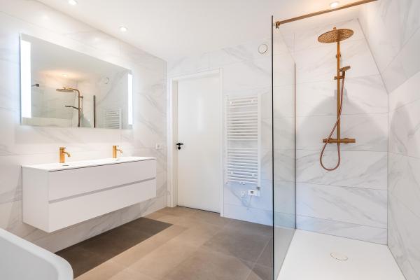 Overloop, 2 ruime slaapkamers, moderne badkamer met inloopdouche, ligbad en dubbele wastafel, separaat toilet, wasruimte.