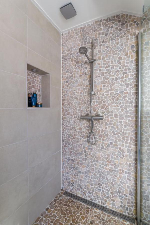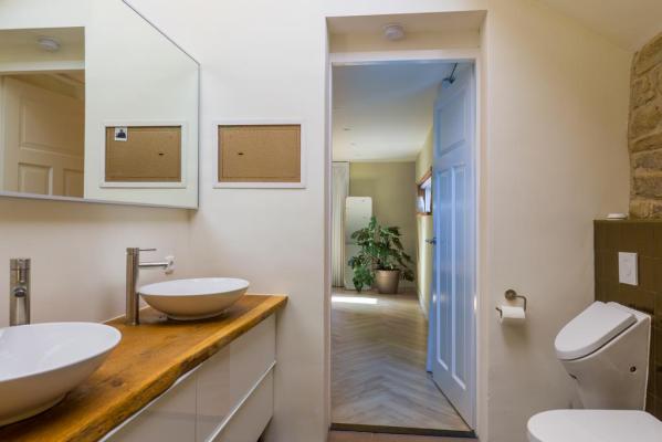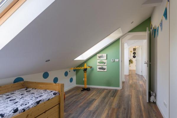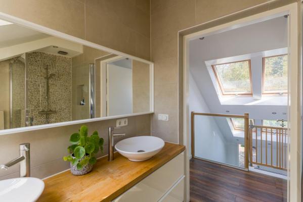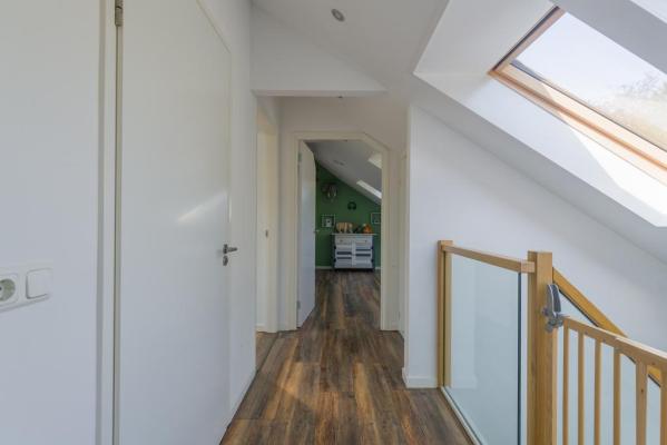 Overloop, 4 slaapkamers, moderne badkamer met douche, wastafelmeubel met 2 kranen en toilet.
