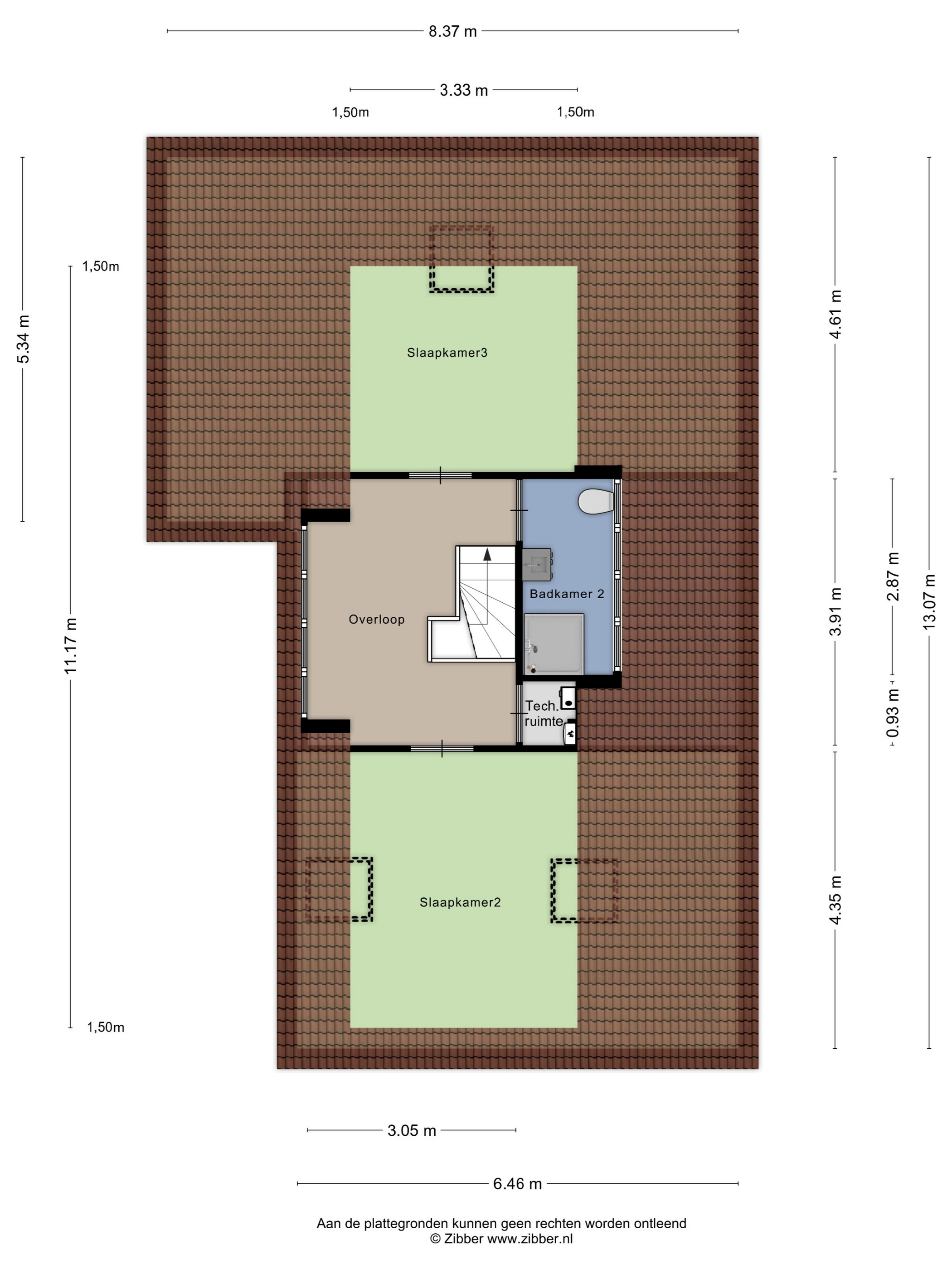Overloop, 2 slaapkamers, moderne badkamer met douche, wastafel en wandcloset, technische ruimte.