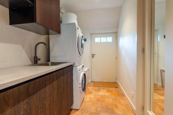 Entree/hal met trapopgang, wandcloset met fonteintje, gezellige living met afgeschermde werkruimte en open haard, luxe woonkeuken met Frans keukenhaard en voorzien van diverse inbouwapparatuur, master bedroom met walk-in-closet en eigen moderne badkamer met inloopdouche, ligbad, wastafelmeubel en toilet. Vanuit de zowel de hal als de badkamer kunt u de bijkeuken betreden met opstelplaats voor de wasmachine, keukenblok en hybride c.v. ketel.