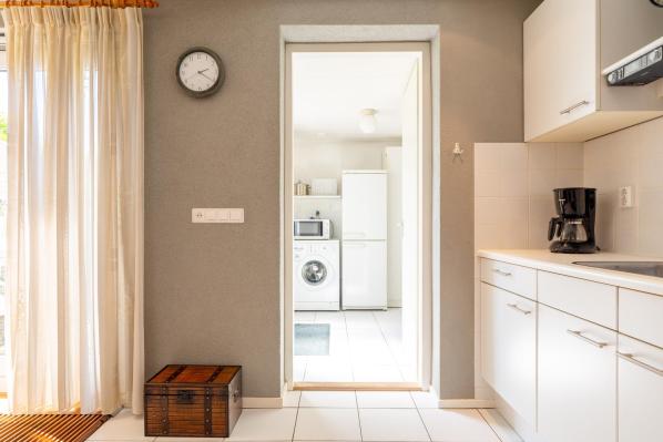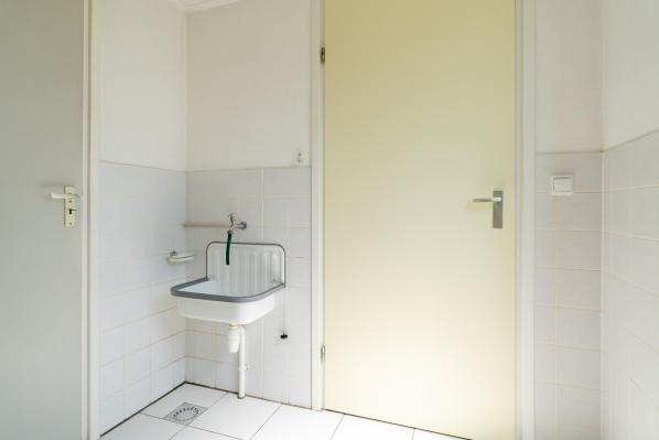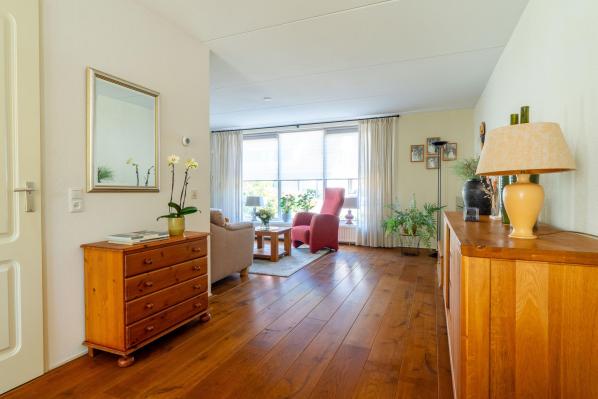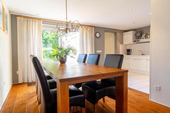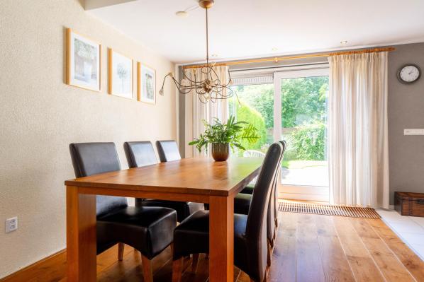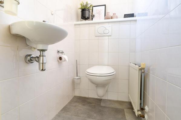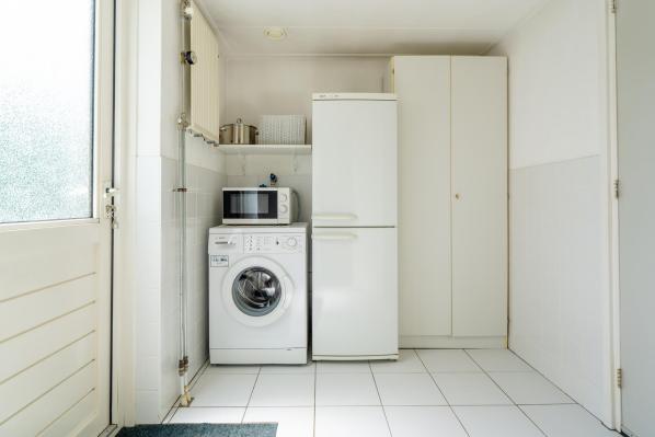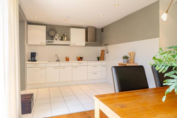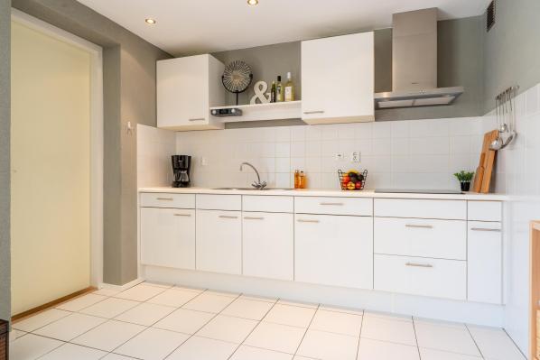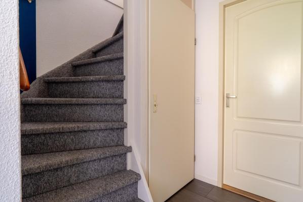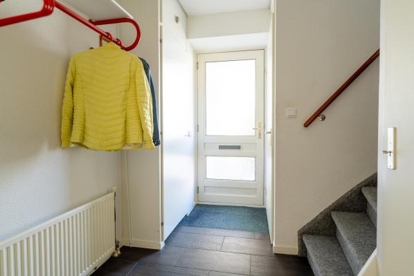 Entree/hal met trapopgang en trapkast, toilet met fonteintje, L-vormige living met schuifpui naar de achtertuin en een nette open keuken, bijkeuken met toegang naar de garage en naar de achtertuin.