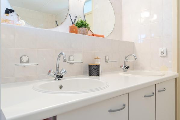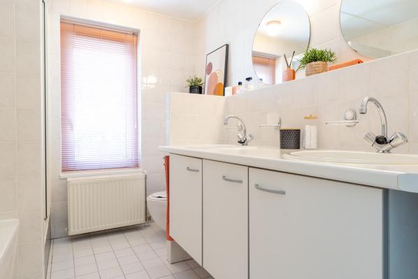Overloop, 3 slaapkamers, badkamer met douche, ligbad, dubbele wastafel en toilet.