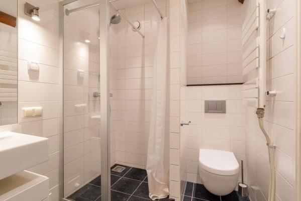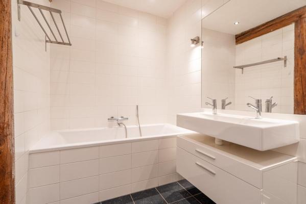 Overloop met wasruimte, 4 slaapkamers, nette badkamer met douche, ligbad, wastafelmeubel met twee kranen.