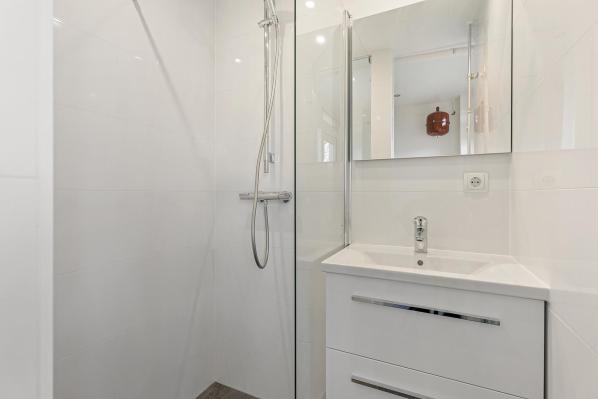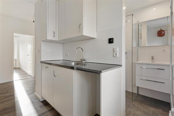 Entree/ruime hal, modern toilet, diepe woonkamer, nette keuken voorzien van enige inbouwapparatuur, moderne badkamer met douche en wastafel, 2 slaapkamers van ca. 11 en 9 m².