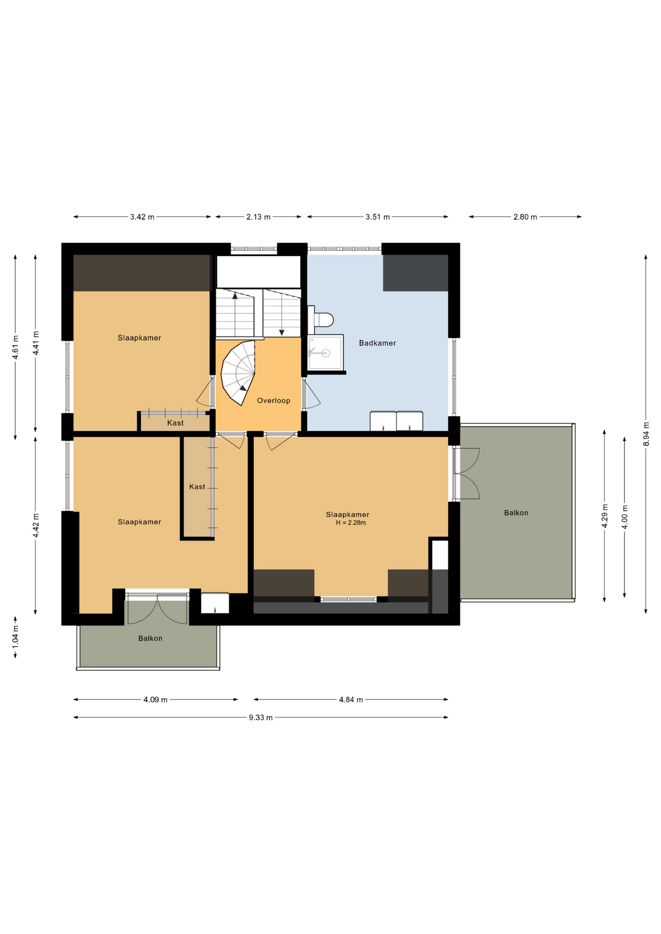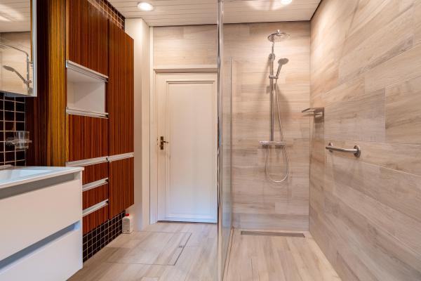 Overloop, 3 slaapkamers, waarvan twee met toegang tot een balkon, badkamer met douche, dubbele wastafel en toilet.