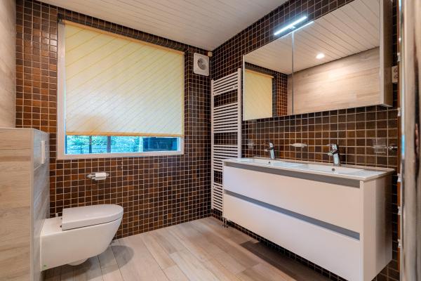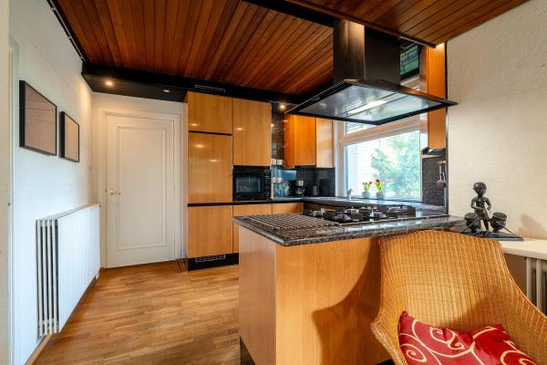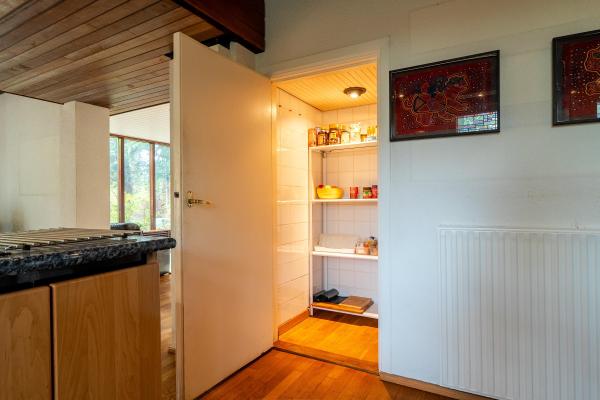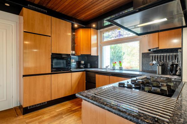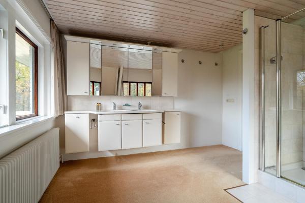 Aan de achterzijde van het woonplattegrond bevindt zich een knusse tuinkamer met aangrenzend de woonkeuken. Vanuit hier loopt u zo het zonneterras op met een geweldig uitzicht op de fraai aangelegde achtertuin. De woonkeuken is ruim van opzet en biedt tevens toegang tot de wijn- en provisiekelder. Voorts bevindt zich aangrenzend aan de halpartij een badkamer op de begane grond.