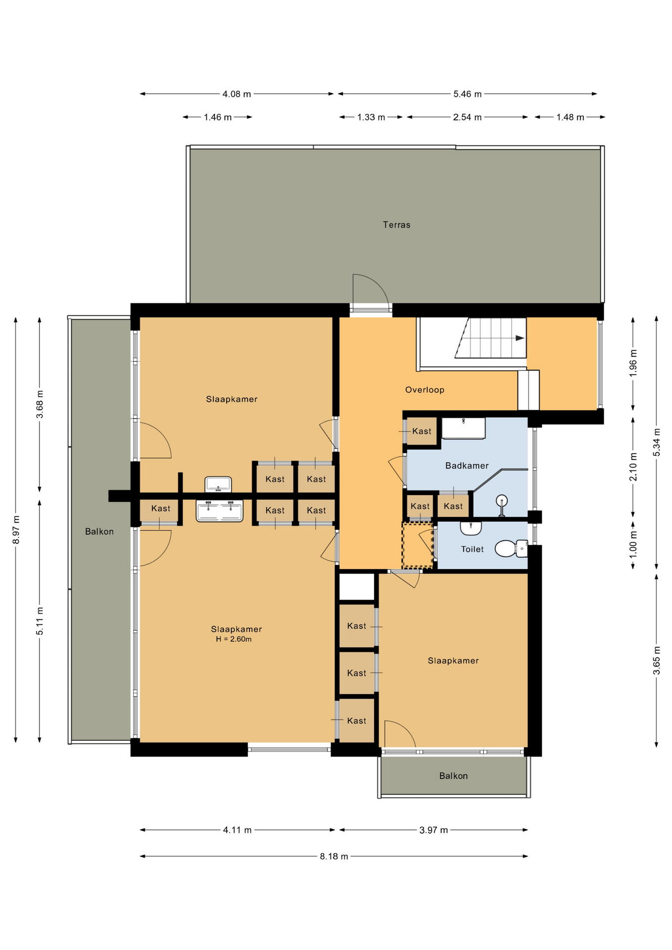Overloop, drie ruime slaapkamers met elk inbouwkasten en toegang tot een balkon, nette badkamer met douche en wastafel, separaat toilet.