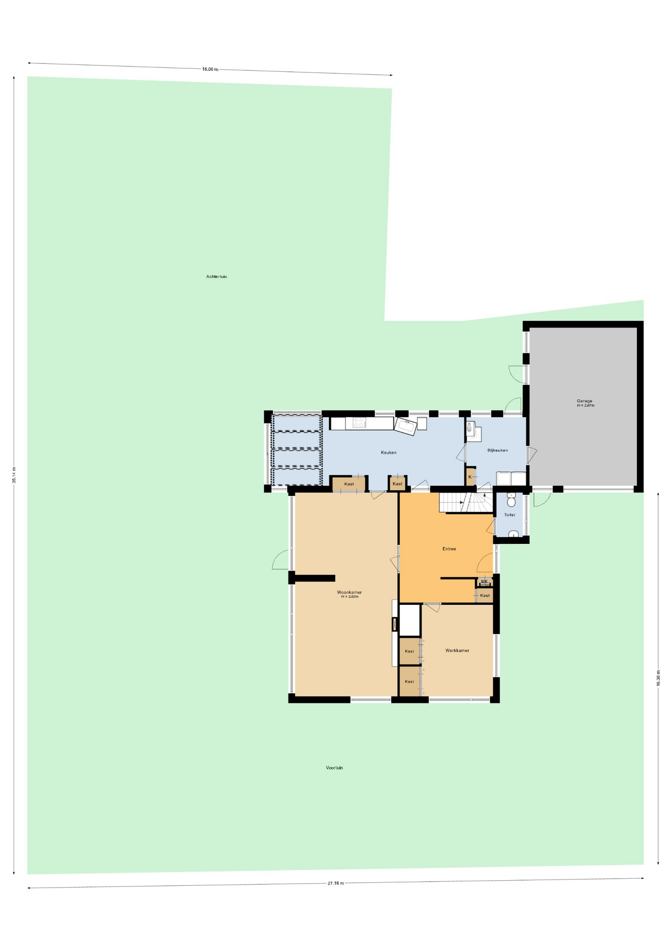 Entree/ruime hal, toilet met fonteintje, ruime lichte woonkamer, keuken met serre, bijkeuken, werkkamer en garage