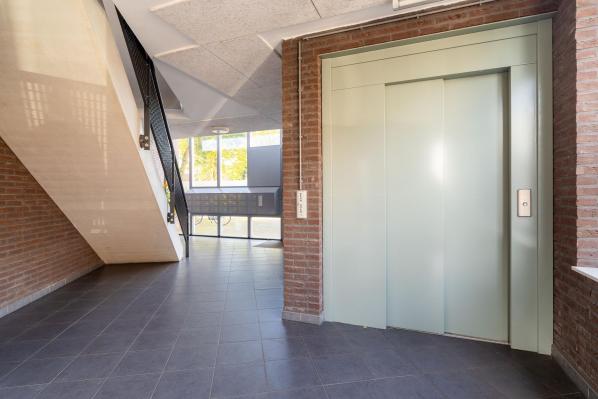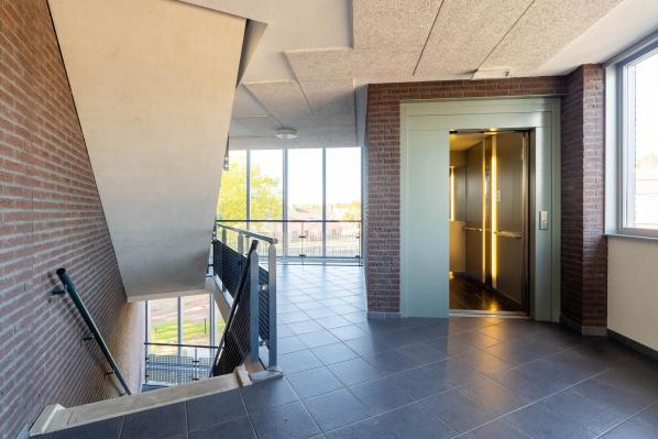 Ruime entree met liftinstallatie, de brievenbussen en de trapopgang naar de verdiepingen.