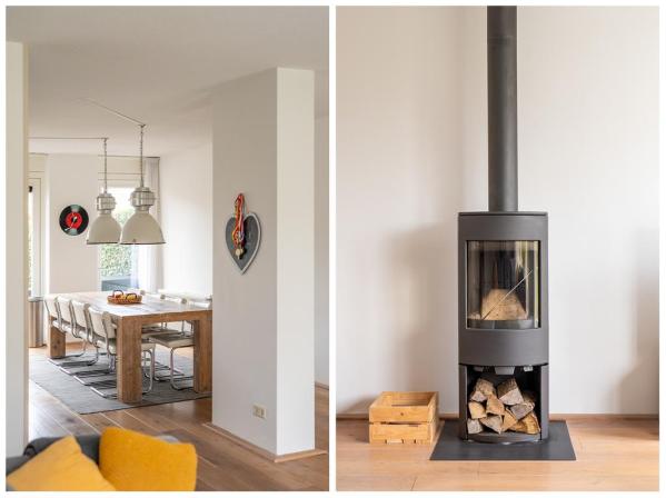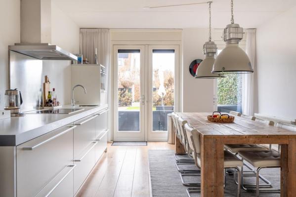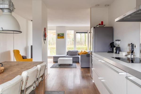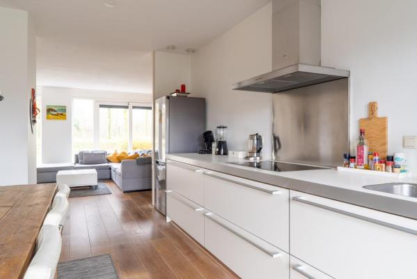 Entree/hal, toilet, woonkamer met houtkachel en toegang tot het balkon, luxe open keuken met openslaande deuren naar de diepe achtertuin op het zuidwesten.