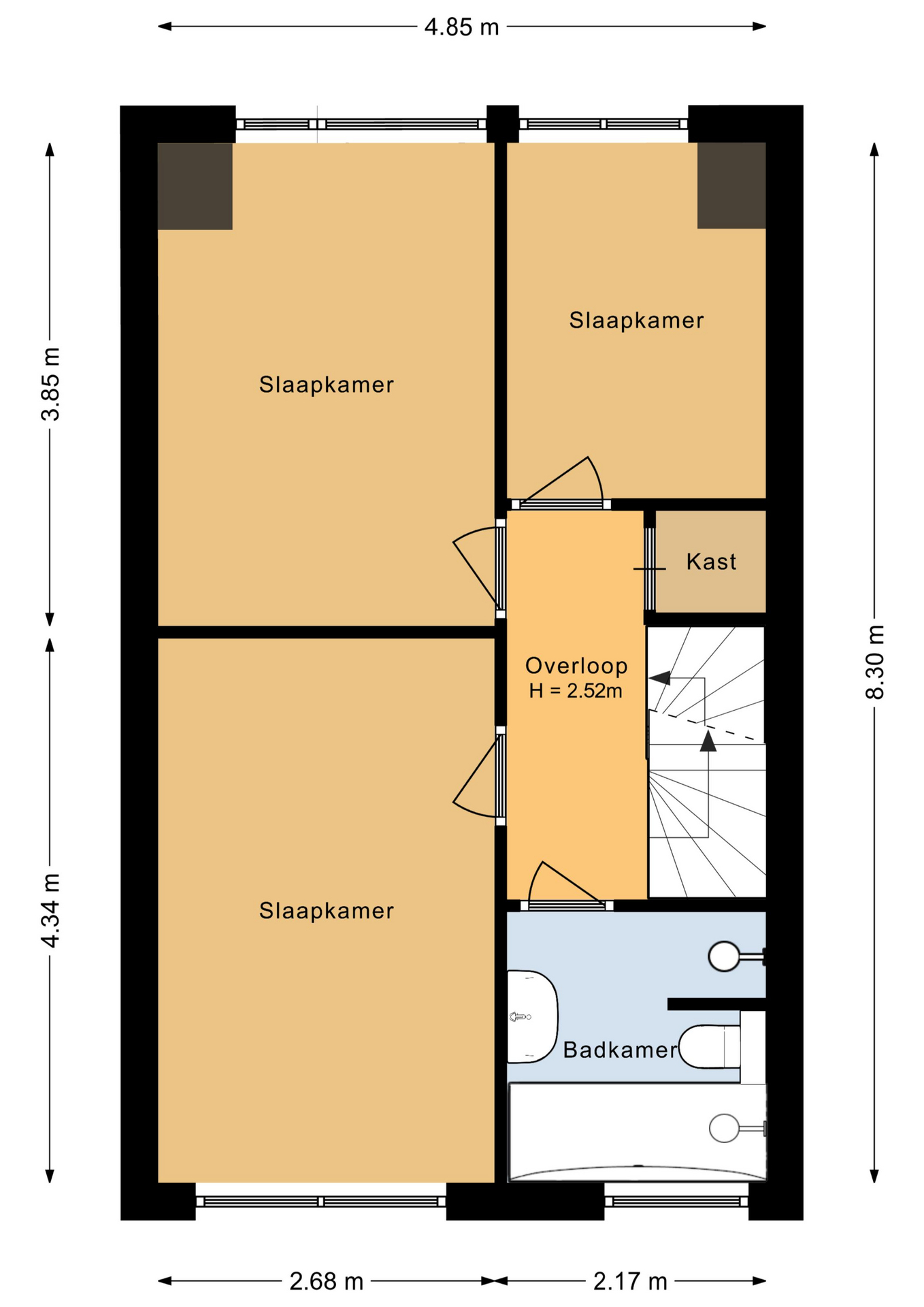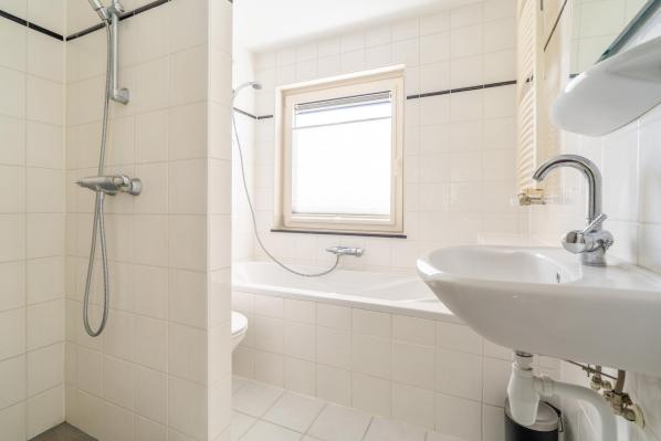 Overloop met bergkast en trapopgang naar de tweede verdieping, drie slaapkamers van circa 12, 10 en 6 m², badkamer met douche, ligbad, wastafel en toilet.