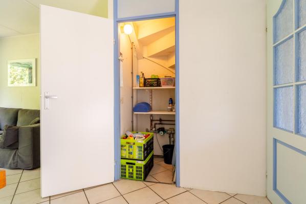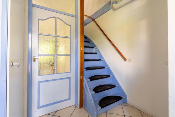 Entree/hal, toilet met fonteintje en trapopgang naar de eerste verdieping en toegang naar de bijkeuken. Lichte woonkamer met trapkast en een open keuken voorzien van diverse inbouwapparatuur. Vanuit de woonkamer is via dubbele openslaande deuren de fraai aangelegde tuin te bereiken met de vrijstaande houten berging.