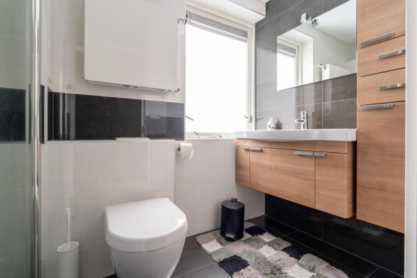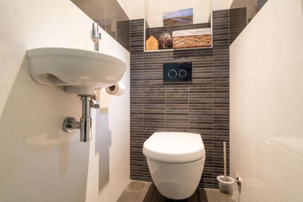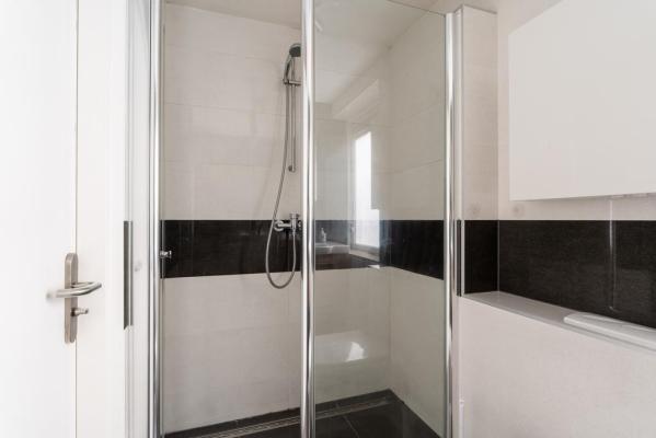 Overloop, 3 slaapkamers, waarvan twee met inbouwkast en één met een inloopkast en vaste wastafel, moderne badkamer met douche, wastafelmeubel en toilet.