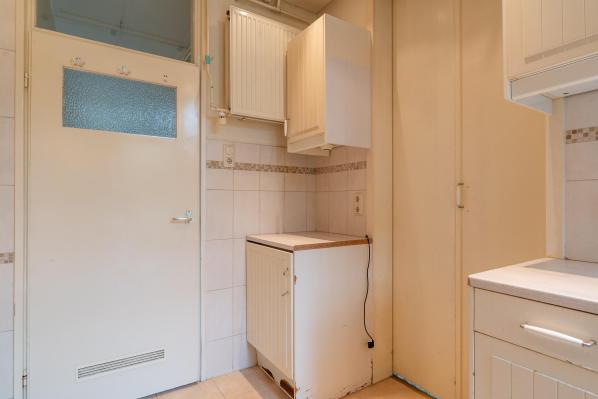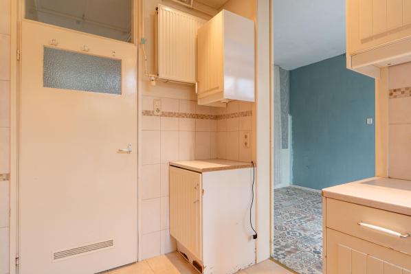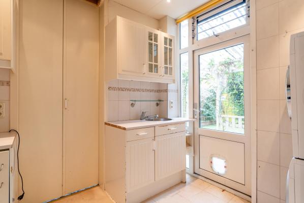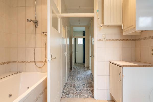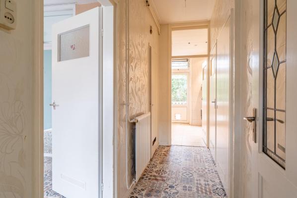 Entree/hal met trapopgang naar de 1e verdieping, toilet met fonteintje, woonkamer met dubbele deuren naar de achterkamer met toegang tot de achtertuin. Voorts bevindt zich op de begane grond een badkamer met ligbad, wastafelmeubel en opstelplaats voor de wasmachine en de droger.